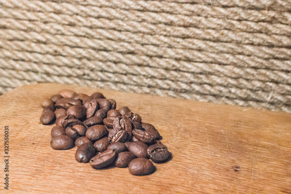 A handful of coffee beans. Grade Arabica. Hot coffee drink. Strong espresso. Grains of medium frying. The menu in the coffee shop. Fragrant drink. Coffee bean close-up. An invigorating morning drink.