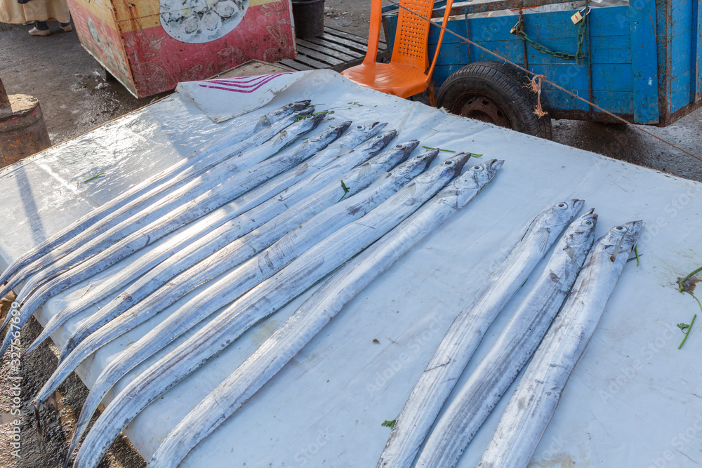 Strumpfbandfische zum Verkauf am Hafen von Essaouira, Marokko