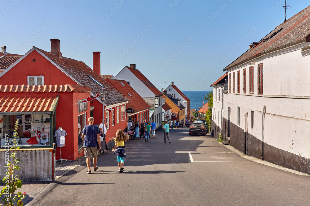 Gudhjem, Bornholm island, Denmark - June 29, 2019. Tourists on a street leading towards Baltic sea in the town of Gudhjem.