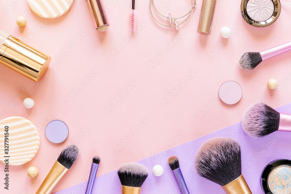 Makeup brushes, sponges and decorative cosmetics on purple and pink colored background. Top view, copy space