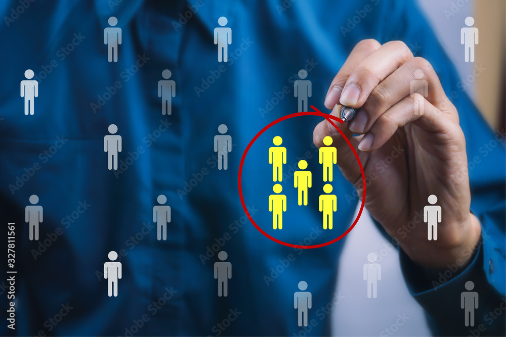 Teamwork or focus niche marketing concept. A businessman write a red line circle around yellow businessman icon.