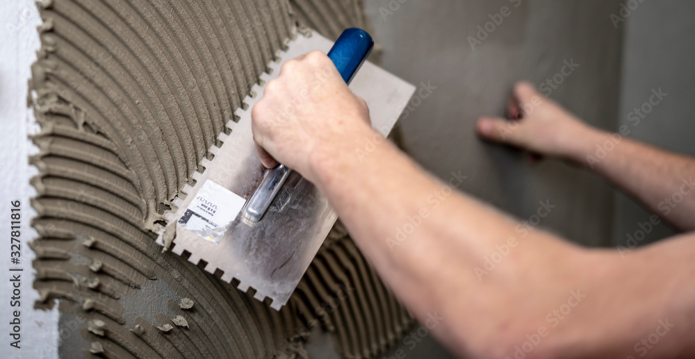 Fliesenleger zieht den Fliesenkleber an der Wand auf