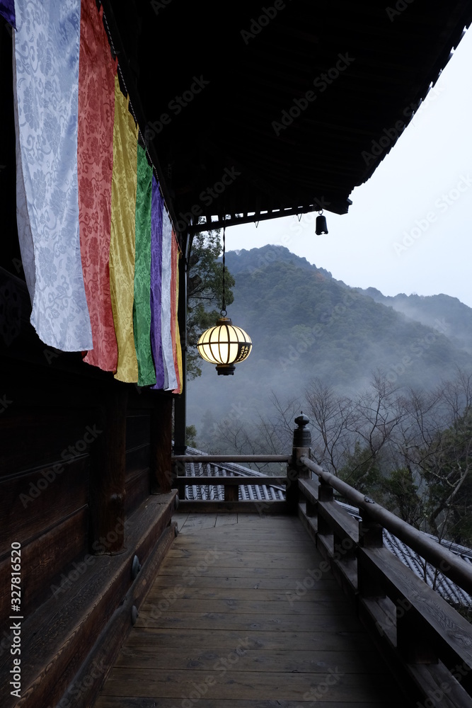 朝霧が漂う、夜明け前の長谷寺(奈良) 大舞台と本堂、灯りがともった長谷灯籠
