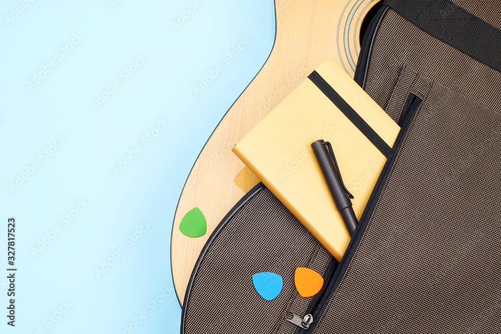 Acoustic guitar soft bag. Slightly open pocket with notes, pen and colorful picks on the blue background. Top view with copy space
