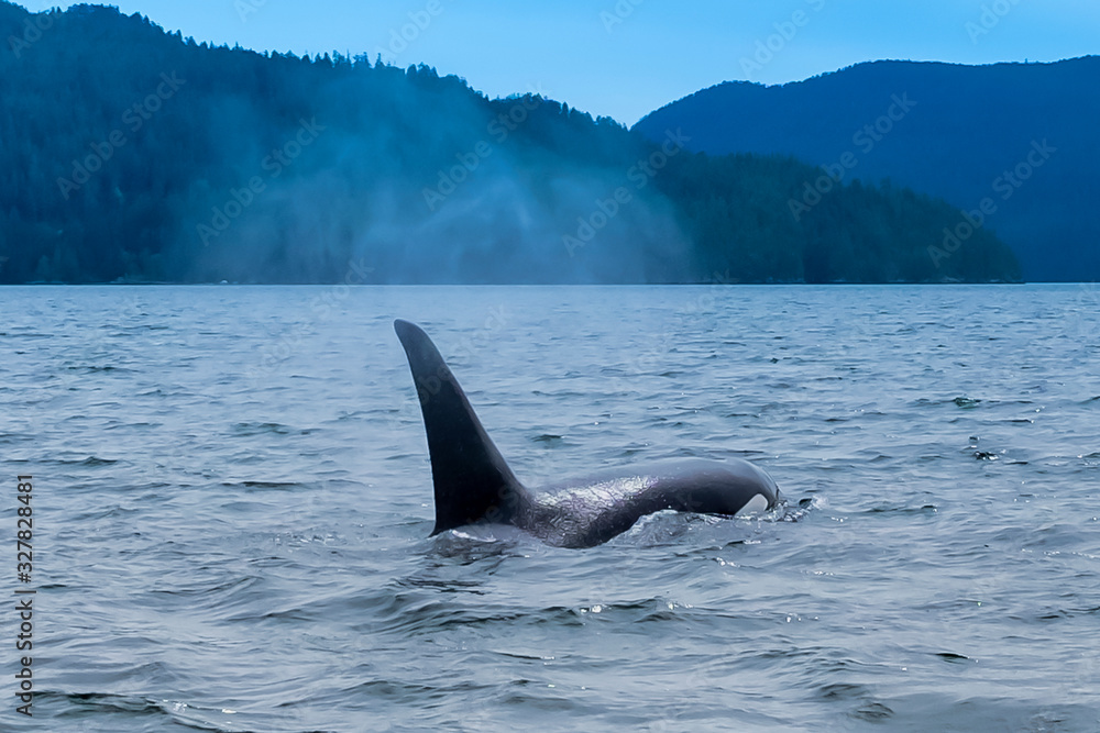 Killer whale in Tofino mountains in background, view from boat on a killer whale