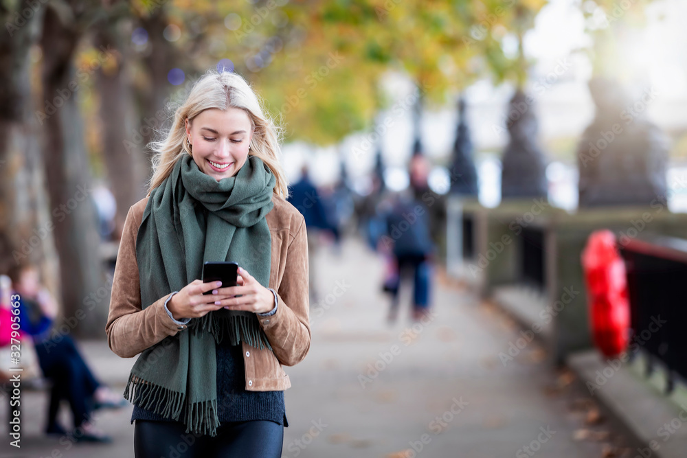 Eine attraktive, blonde Frau läuft auf der Straße und liest ihre Emails und Nachrichten auf dem Mobiltelefon