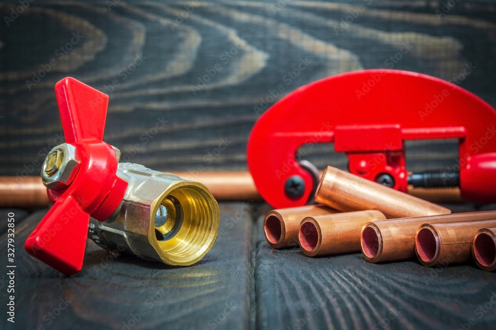 Water ball valve with red handle and copper pipes for plumbing repairs on black vintage wooden boards