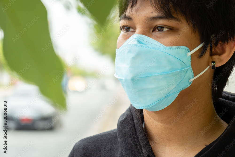 Close up asian man with green hygienic mask prophylactic (virus covit 19 ') .Health and care concept.
