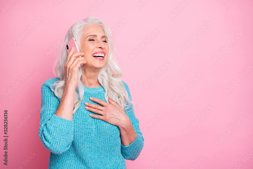 Portrait of positive cheerful old woman use smartphone call her friend hear jokes laugh put hands chest wear good look blue jumper isolated over pastel color background