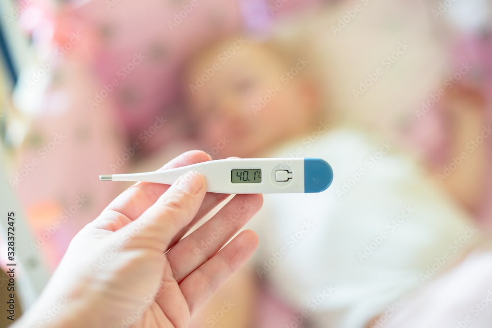 Close-up medical thermometer, Parent measuring temperature of ill kid, 1 years old toddler girl gets high fever lying on bed. fever in child