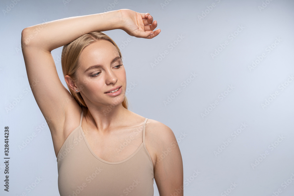 Dreamy young lady in a beige tank top