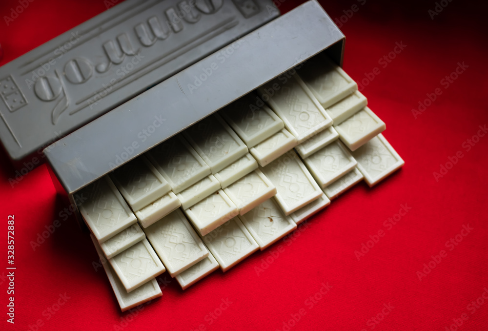 Domino Bones of dominoes fell out of a gray case on a red fabric background and a lot of space for text. The reverse side of dominoes. On the cover of the case is the inscription "Domino"