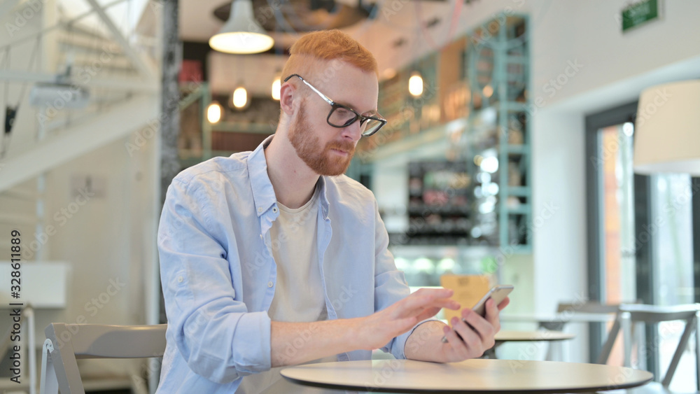 Focused Redhead Man using Smartphone in Cafe