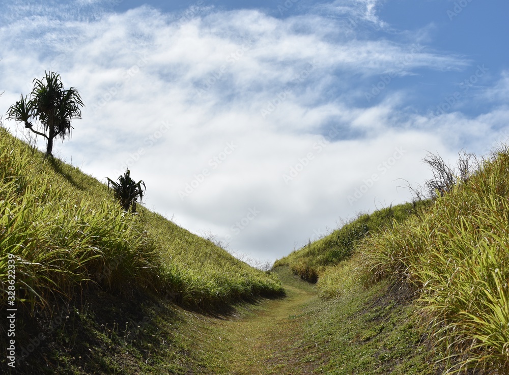 Looking along the trail over the grassy dunes at the Sigatoka Sand Dunes National Park, near Sigatoka, Fiji.