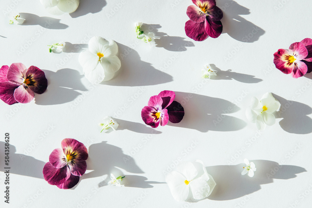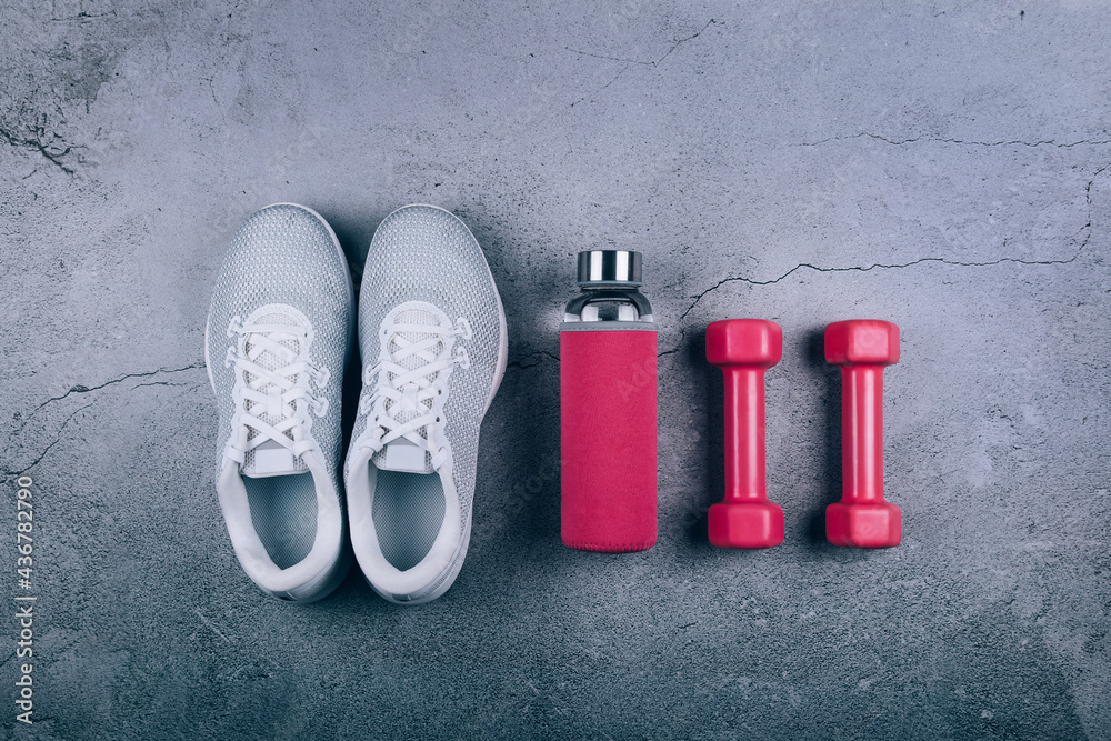 Twisted blue yoga mat, belt and glass water bottle over white background.