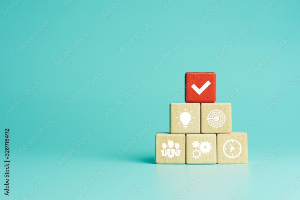 Business process management, Businessman plan a project with wooden cubes with icon business strategy on blue background. copy space