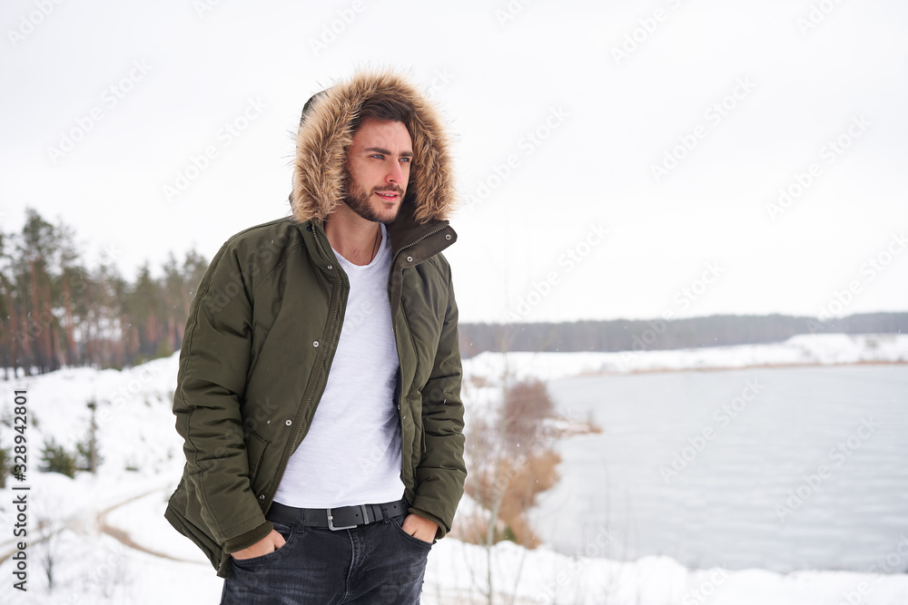 Attractive bearded man standing outdoors in winter season forest.