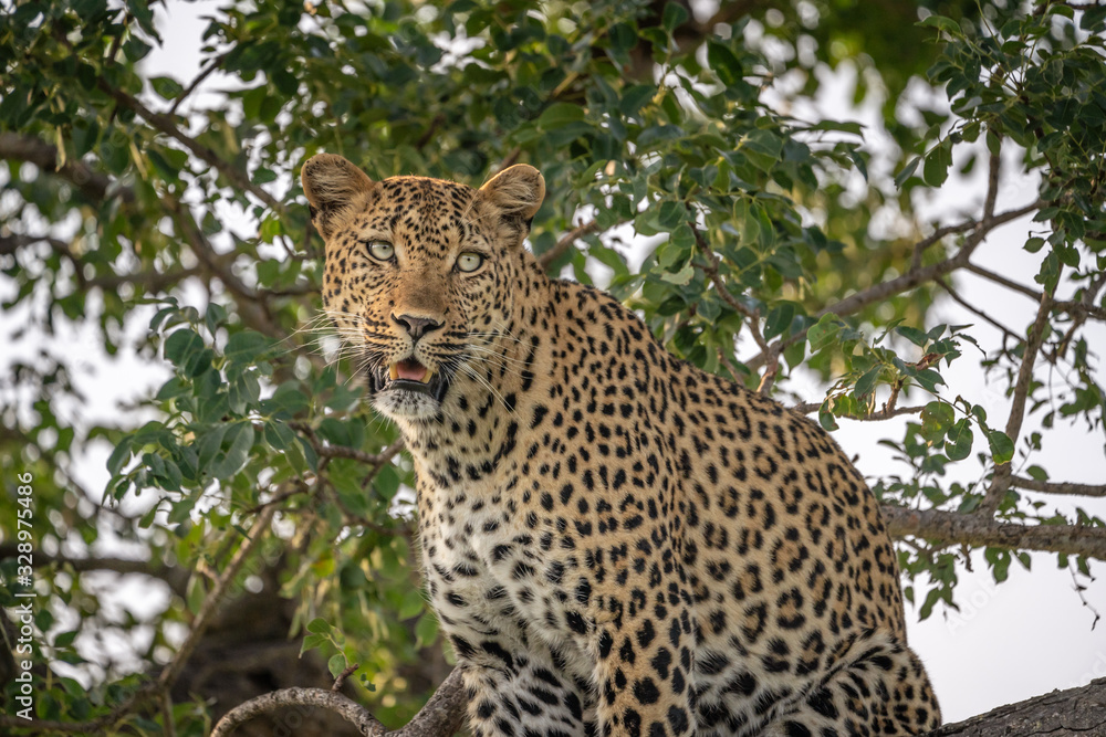 Closeup view of leopard staring right from up in a tree
