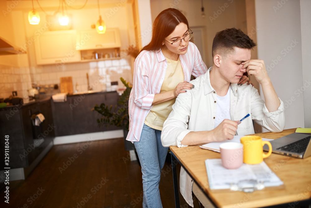 sad guy holding his nose, having headache, wife standing behind him and trying to cheerf him up. close up photo. don't worry. difficulties.man trying to solve, overcme problems