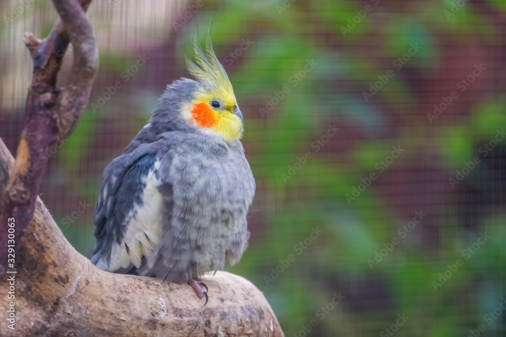 Closeup portrait of a cockatiel sitting on a branch, tropical bird specie from Australia