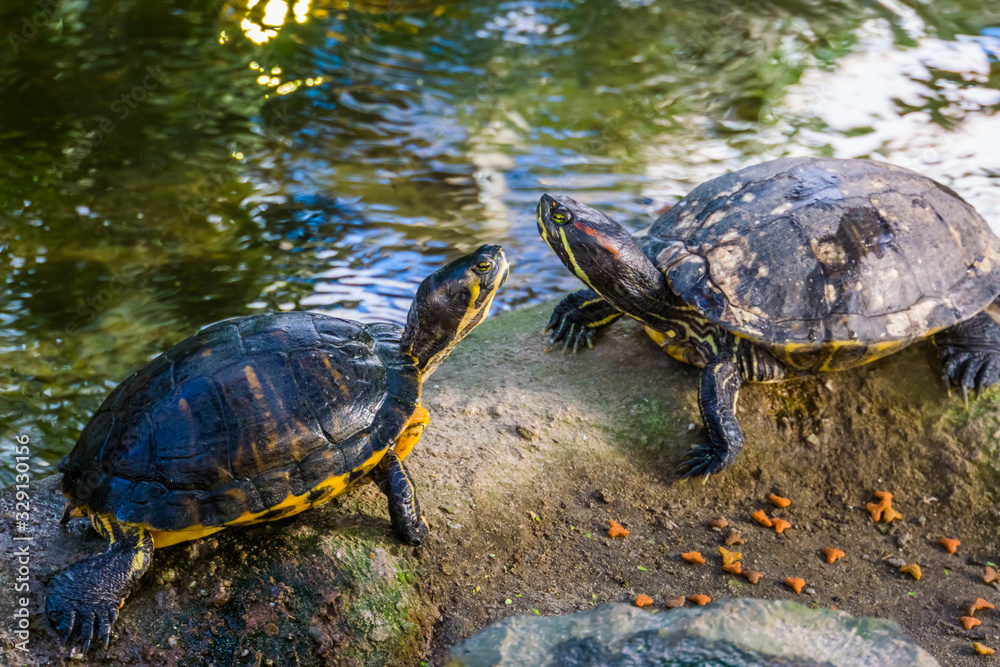 cumberland slider turtle couple together on a rock, tropical reptile specie from America