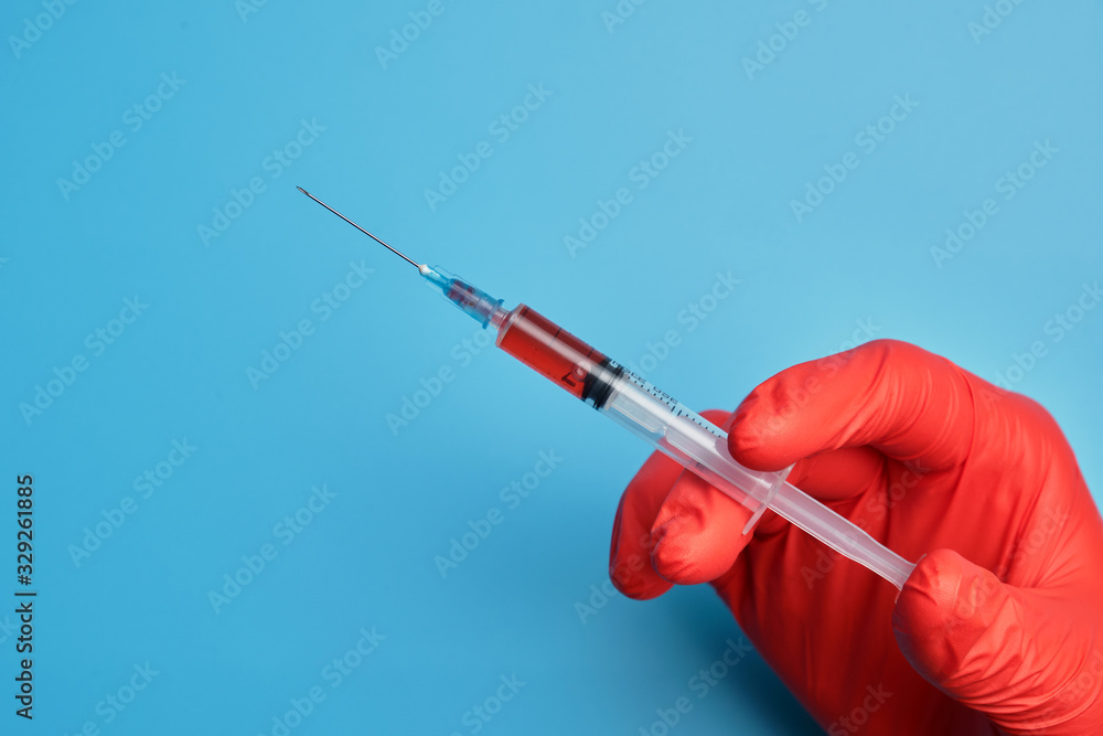 Doctor in red gloves holds a syringe with a vaccine on a blue background.