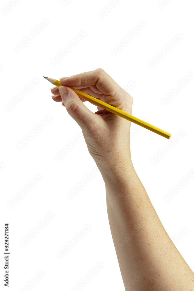 Elegant woman's hand holding a yellow lead pencil. Useful for presentations and visual graphics on whiteboards. More photo's with same graceful hand. Easy to isolate and stand free into .png