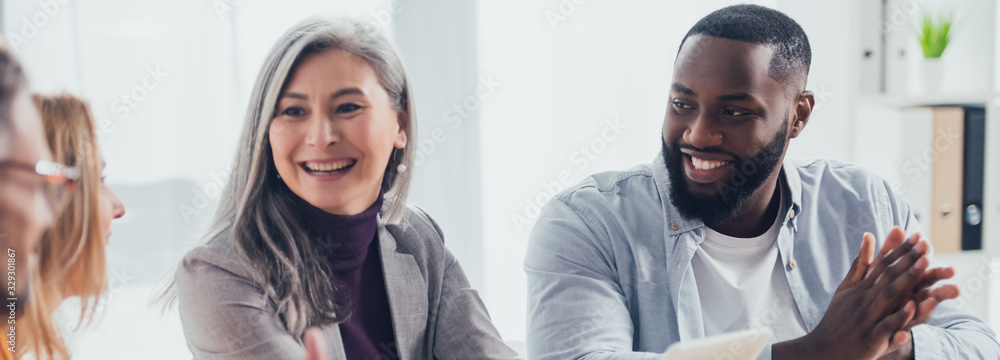panoramic shot of multicultural colleagues clapping and looking at each other