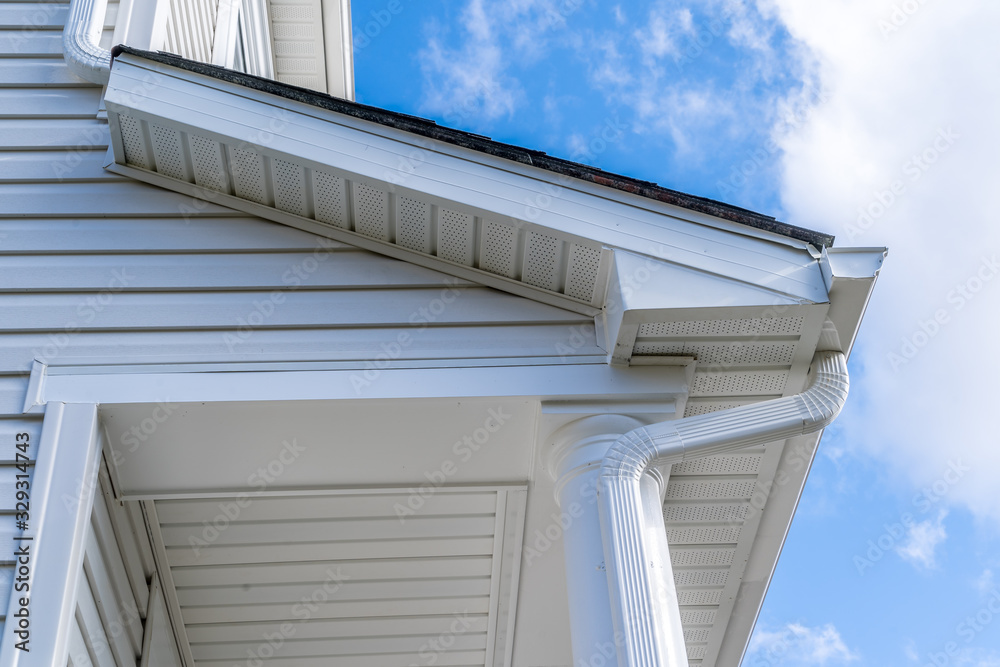 Classic white gutter system that collects water shedding off the roof, with slip connector, end cap, elbow tube, gutter hanger, gutter drop connecting the outlet to the downspout with soffit, fascia