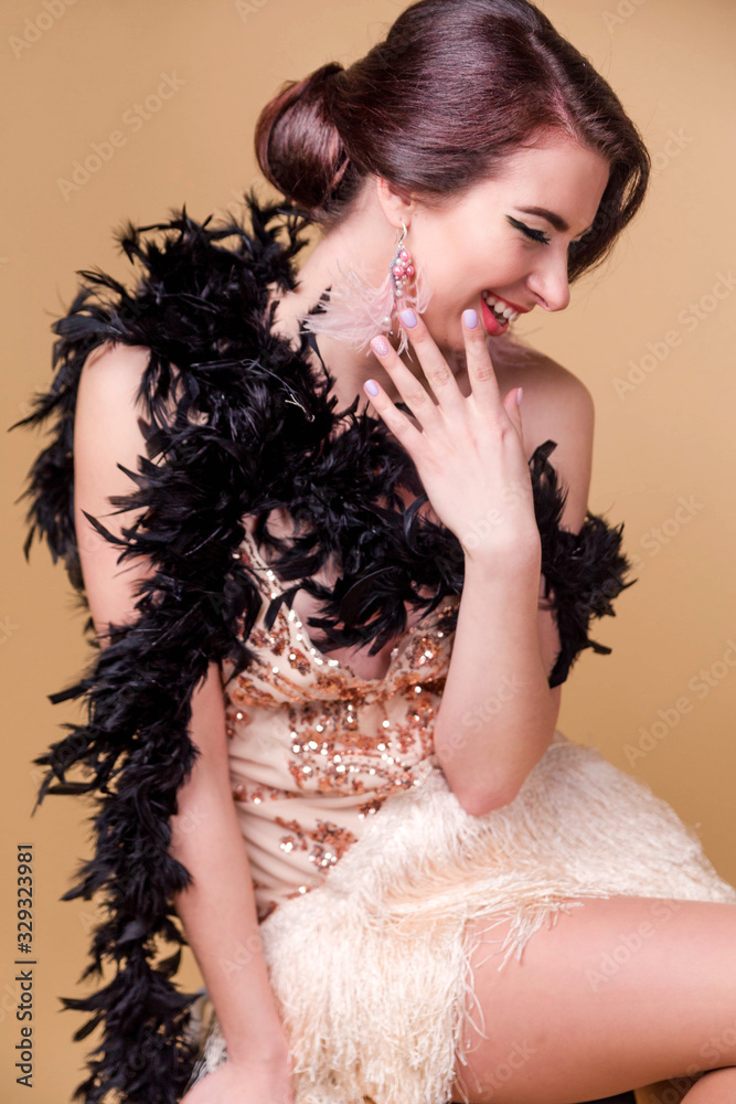 beautiful brunette woman in boa from ostrich feathers is posing and smiling on beige background