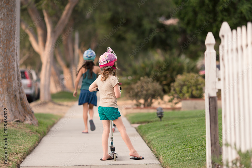 Girls are wearing safety helmets while scootering on the sidewalk of their LA city.