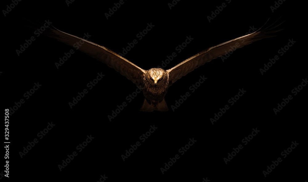 Art in nature Photography. Spot light and birds. Black background.