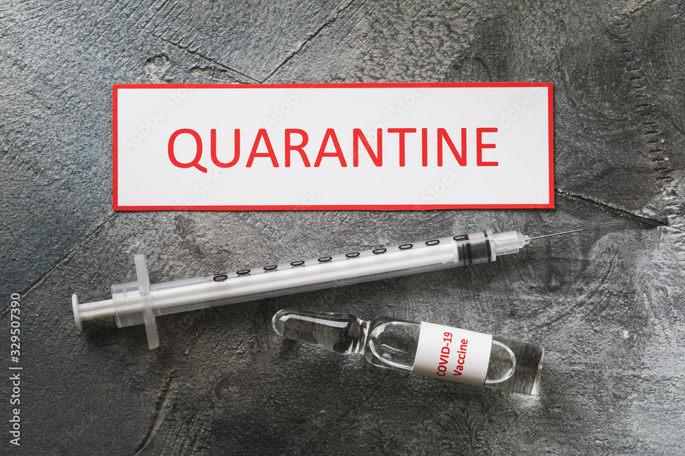 Label with inscription, syringe and ampoule with COVID-19 coronavirus vaccine. Concept of a quarantine