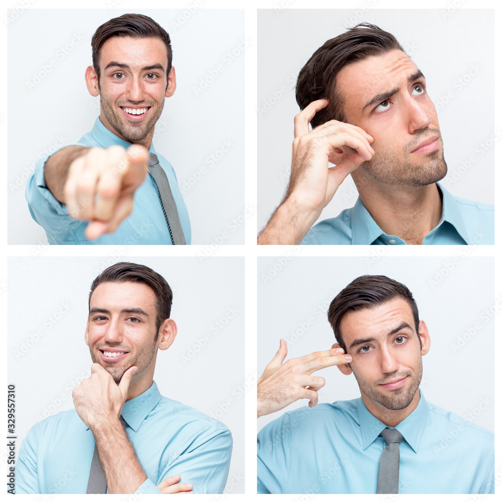 Male professional portrait set with different gestures and facial expressions. Positive, confident, bored man studio shot collage. Multiscreen montage, split screen collage. Emotions concept