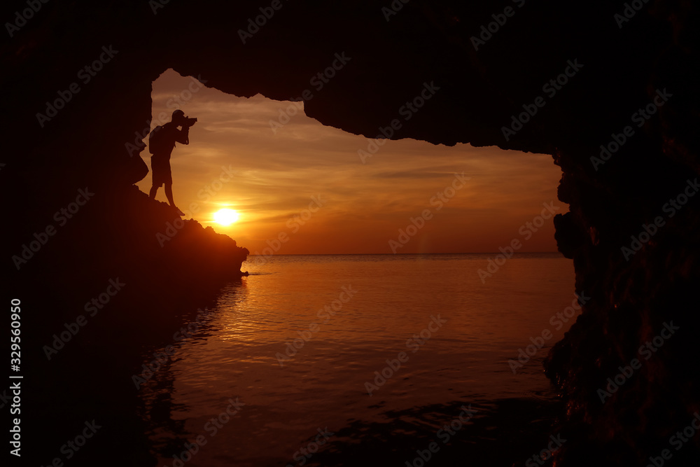 Silhouette of photographer using the camera to take photo of the sunset in a cave by the sea