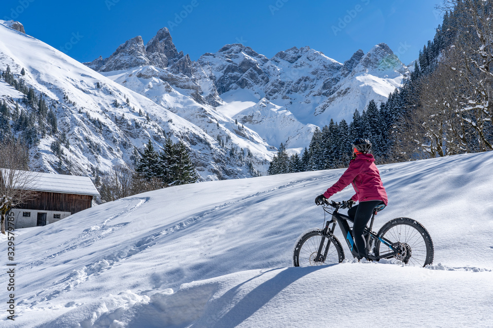 nice senior woman riding her electric mountainbike on a sunny winter day in the Allgau alps near Oberstdorf, Bavaria, Germany