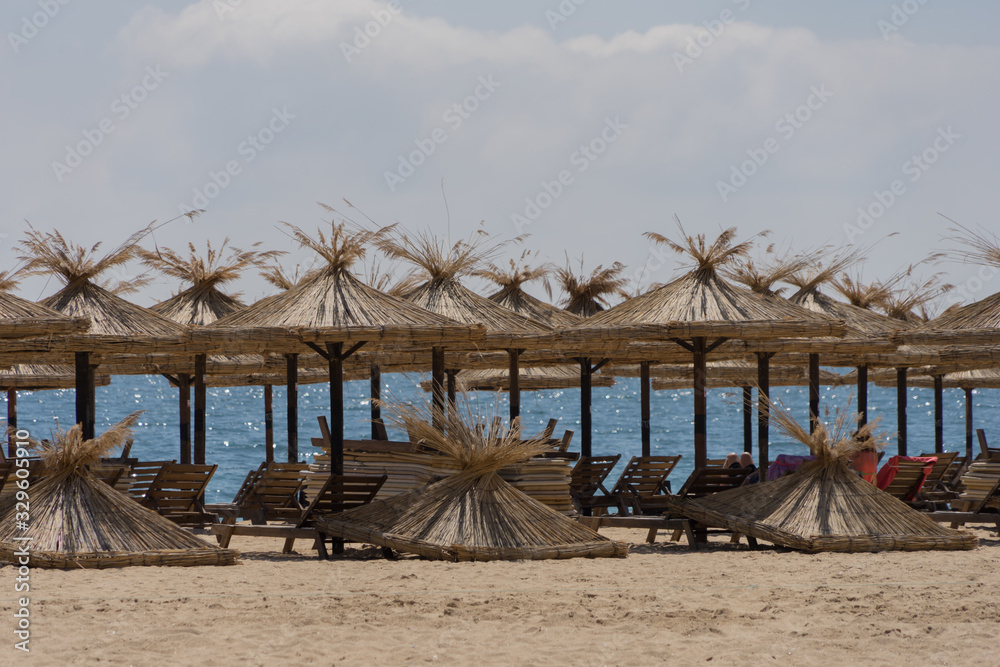Schirme und leere Liegen am Strand
