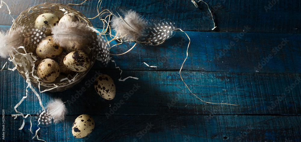 Easter banner background; Retro style picture with Easter eggs and feathers in silver basket on dark blue background. Top view, flat lay with copy space.