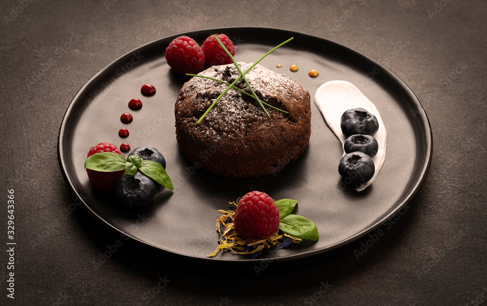 Chocolate muffins with raspberries and blueberries on a black plate with backlight, Food photo with bright colors, texture and details