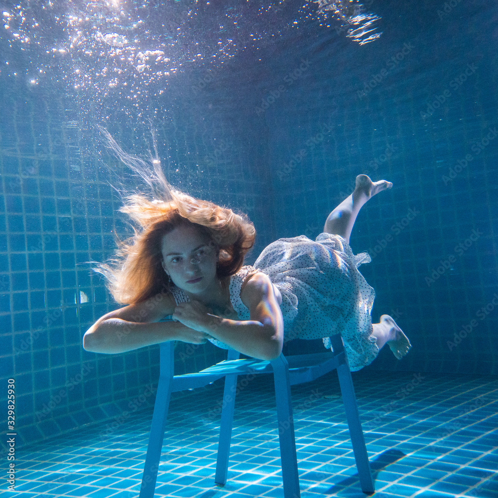 Beautiful woman with long red hair posing underwater on the chair in white dress