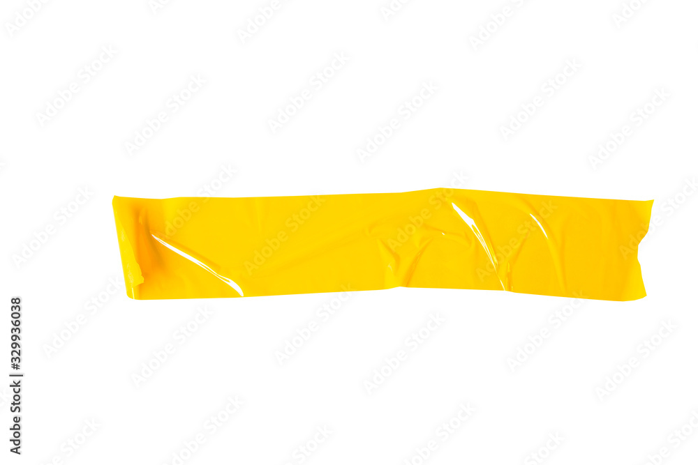 yellow tapes on white background. Torn horizontal and different size yellow sticky tape, adhesive pieces.