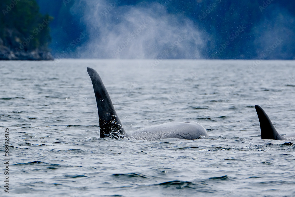 Two killer whales in Tofino with the fin above water, view from boat on two killer whale