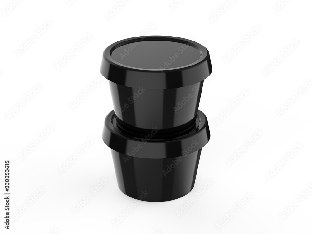 Round black plastic container for butter, cosmetics cream or margarine spread, mockup template on isolated white background, 3d illustration.