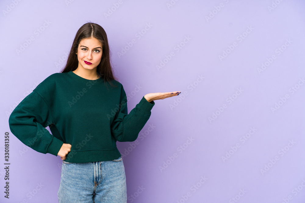 Young caucasian woman isolated on purple background doubting and shrugging shoulders in questioning gesture.