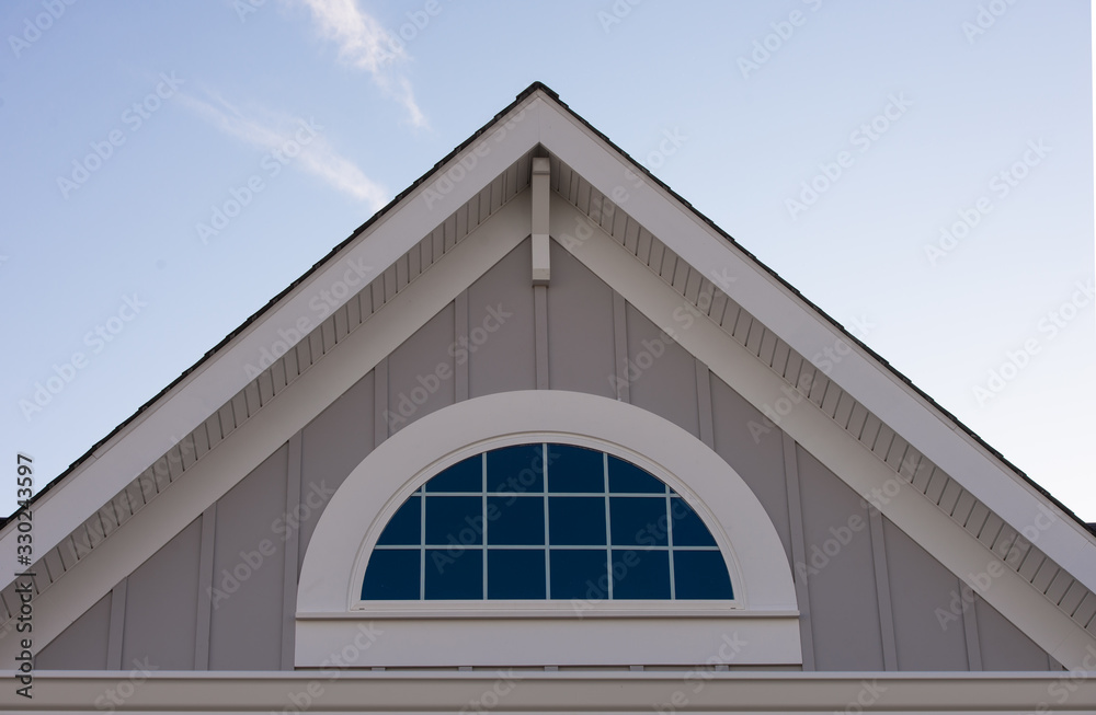 Half round decorative attic window with white grilles on desert tan vertical lap vinyl siding, gable, louver at luxury American single family home in the East Coast USA with blue sky background