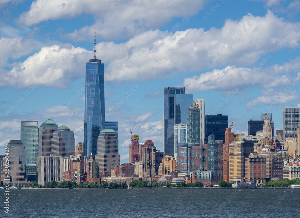 New York, NY, USA. Amazing skyline of Manhattan skyscrapers and buildings from Ellis Island. Landscape inclusive of the Freedom tower - One World Trade Center