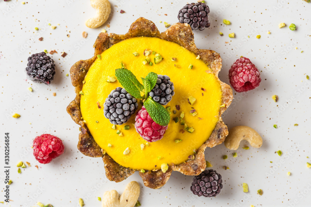 Vegan food dessert. raw vegan yellow cashew mango tart with frozen berries, pistachios and mint. close up
