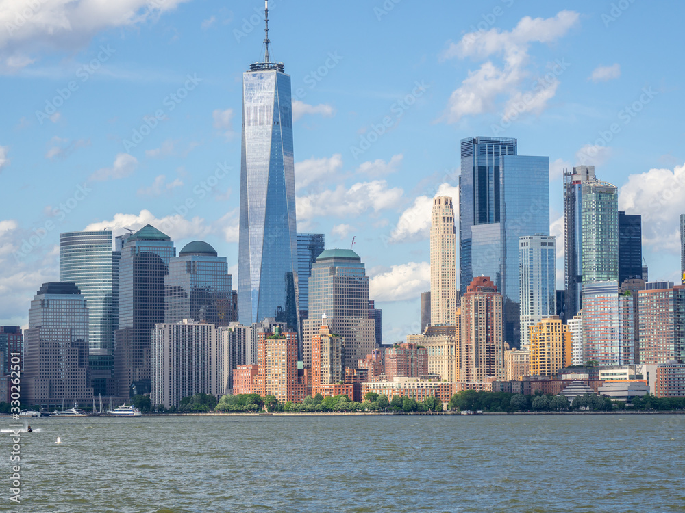 New York, NY, USA. Amazing skyline of Manhattan skyscrapers and buildings from Ellis Island. Landscape inclusive of the Freedom tower - One World Trade Center