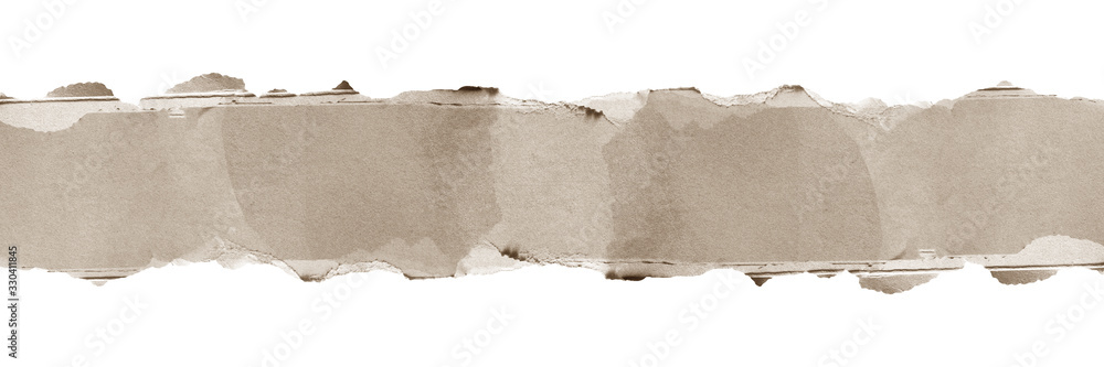 Brown corrugated texture paper torn on white background. rip of cardboard sheet used as a background .