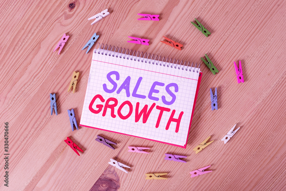 Handwriting text writing Sales Growth. Conceptual photo ability to increase revenue over a fixed period of time Colored clothespin papers empty reminder wooden floor background office